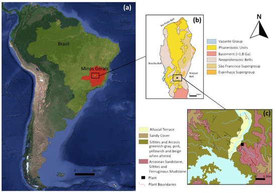 (a) Geographical location of the study area located in Minas Gerais state, South Brazil; (b) São Francisco Craton and its subdivisions; (c) geological setting and delimitation of the plant’s area of influence [2,3].