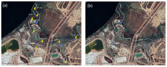 (a) Location of samples analyzed for geochemical characterization in the plant’s area of influence; (b) test samples’ location for zero-valent iron nanoparticles (nZVI) technology assessment.