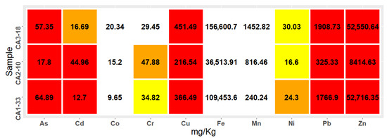 Heat map of the concentrations of the extractable forms of the metallic elements (by aqua regia digestion; evaluation of the degree of contamination) of the samples used in the laboratory assay. Color label: red—above the critical content; orange—caution content; yellow—content above the quality limits for soils [53] and sediments [54].