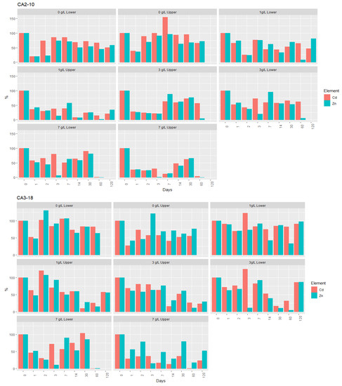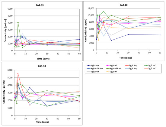 The uniformity of the pH variation over time was directly proportional to the suspension’s concentrations. In the columns corresponding to the injection of the solutions with higher concentrations (3 and 7 g/L), there was an abrupt drop of the pH values after 2–3 days and a more gradual rise after 7–14 days, with a plateau after 60 days. The exception is the alluvium sample CA2-10, which kept low pH values until the end of the tests—120 days (see values in Table 3).