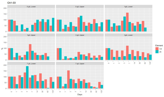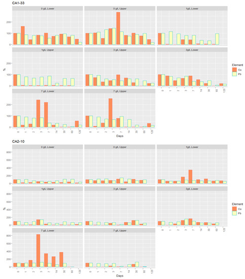According to previous studies [1,7,9], in addition to the excessive concentrations from the surface to the deepest layers (80–100 cm), they occur in easily mobilized phases (soluble, exchangeable cations, associated with Mn-oxides) and spread rapidly to areas further from the source of contamination, thus representing the elements with the greatest environmental hazard. In these three samples, 80–100% of Cd and Zn occur in these more labile forms, whereas Pb and Cu have a lower solubility and more heterogeneous distribution (Pb: 25% in CA2-10, 60–70% in CA3-18, and 45–55% in CA1-33; Cu: 10–20% in CA2-10; 60% in CA3-18, and 20–40% in CA1-33). Although As values exceed the critical values, this element has a heterogeneous behavior over the area of concern but, in general, only 20% occur in more mobile fractions.