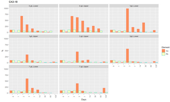 Changes in the Pb and Cu contents (%) in the soluble phase of samples, over 120 days of the remediation batch tests after the injection of nZVI suspension (concentrations of 0, 1, 3, and 7 g/L).