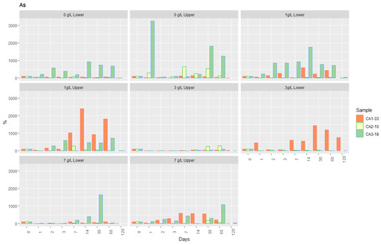 Changes in the As contents (%) in the soluble phase of samples, over 120 days of the remediation batch tests after the injection of nZVI suspension (concentrations of 0, 1, 3, and 7 g/L).