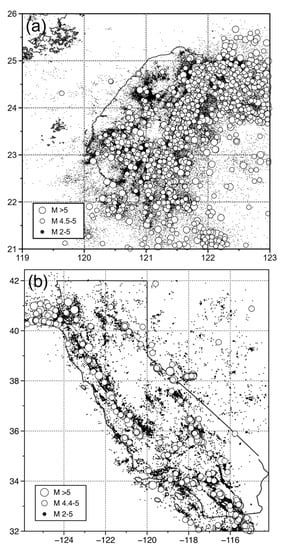 (a) The seismicity selected from the Central Weather Bureau Seismic Network in the time span from 1 January 2001 to 31 August 2021 and magnitude interval from 2.0 to 5.0 in Taiwan, and (b) that selected from the California Integrated Seismic Network: Northern California Seismic System and Southern California Seismic Network in California, with the same criteria in California.
