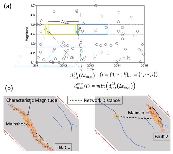 With the targeted earthquakes classified at magnitude intervals of 0.1, we calculated the distances between each event and their subsequent events of “equal” magnitude occurring within a given time window. This time window was defined as , where is the average interevent time for specific magnitude m and n lying between −2.0 and 1.0 at intervals of 0.1. The different values of n correspond to the scales to zoom in or zoom out of the average interevent time. Assuming the number of events of magnitude m is k and the number of those in a time window is l, the interevent distance for the ith event in this time window would be defined as , where and and the difference of the event time would follow , as illustrated in Figure 2a. The shortest interevent distance for ith event was set as network distance , some possible cases of which are given in Figure 2b.