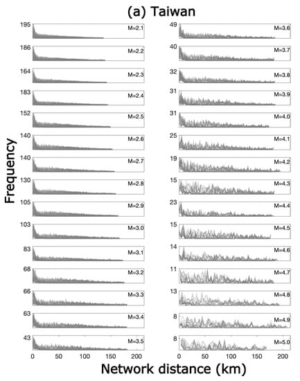 The frequency distribution of network distance in Taiwan (Figure 3a) shows the characteristics of a power law distribution with a high peak in the short network distance (<10 km) region and a long tail, similarly to the Gutenberg–Richter law or the modified Omori law. Meanwhile, the increased frequency at the median network distance (<150 km) may suggest a distribution that is controlled by the physics of background earthquakes. A natural system such as a fault system is always proceeding toward maximum entropy under the condition of least-informative default. From this point of view and the distribution shape, we presumed that a lognormal distribution presenting the multiplicative product of many independent random variables may be able to describe the development process of the background earthquakes.