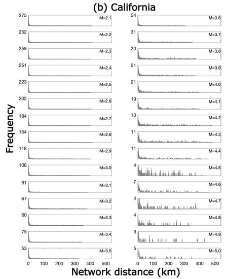 Frequency of the network distance in different magnitude bins, as labeled at the top right corner of each panel for (a) Taiwan and (b) California. The tick of the y axis shows the maximum frequency.