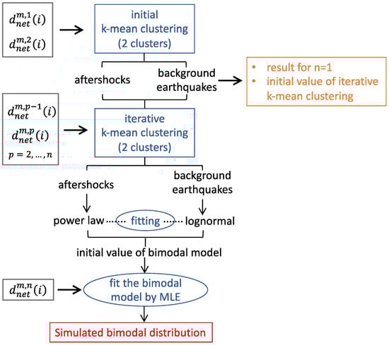 The flowchart of the data analysis. The network distances are imported into the k-mean clustering as the input data and be discriminated into two groups that are aftershocks and background earthquakes since the network distances of aftershocks are inherently shorter than background earthquakes, as illustrated in Figure 2, and can be recognized as a different group in k-mean clustering. In addition, each network distance corresponds to one event with magnitude m, and therefore, the interevent time of the aftershocks and the background earthquakes can be calculated according to the results of the k-mean clustering. Following all the steps, we can fit the network distances with a bimodal distribution as Figure 5 that would give a probability of successful prediction of the aftershock cluster. In addition, the relationships of network distance with the magnitude and interevent time for aftershocks and background earthquakes can be statistically studied.