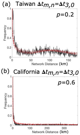 Frequency distribution of network distances for 3.0 < M ≤ 3.1 earthquakes in (a) Taiwan and (b) California occurring within the average interevent time (n = 0) and fitting results. The red solid lines show the predicted bimodal distributions, the red dashed lines show the 95% confidence interval, and the parameter p is as labeled.