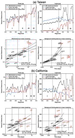 The spatiotemporal relation of aftershocks and background earthquakes in (a) Taiwan and (b) California. The left and right panels show the results using aftershocks and background earthquakes categorized by k-means, respectively. The top and bottom panels show the relationships of the network distance with magnitude and time, respectively. In the relationships of the network distance with magnitude (top panels), the modes of the network distances for different time windows and magnitudes are calculated; the red curves show that the time window equals to the average interevent time and the black curves show the mean of the modes. The blue curves show the network distance at the highest frequency of the fitted power law distribution and the lognormal distribution. In the relationships of the network distance with time (bottom panels), the network distances are the same as the black curves, and the time is the mode of the mean of interevent time. The black and red circles show the results for the events with magnitudes smaller and larger than the characteristic magnitude, respectively.