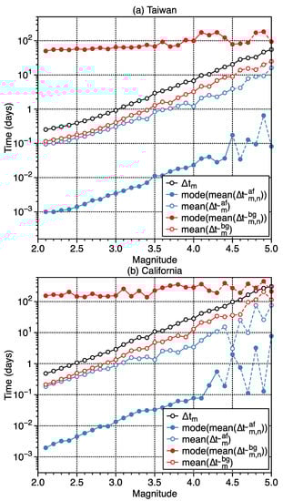 Another common phenomenon observed in the cases of Taiwan and California is the overestimation of the interevent time for aftershocks and underestimation of that for background earthquakes, which is shown in Figure 7. The scaling law between the interevent time and magnitude showed a significant difference for aftershocks and background earthquakes when the time window is not presumed to be the average interevent time. This actually corresponds to the bimodal distribution of interevent time that has been reported in many regions [34,35,40].