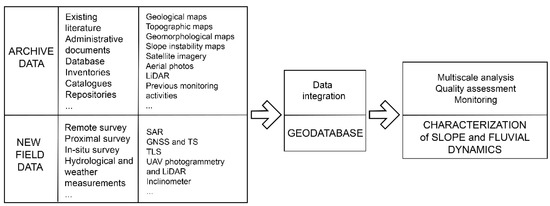 The analysis of the state-of-the-art surveying methodology and the limitations concerning the investigation of slope and fluvial dynamics highlighted the need to design a suitable geodatabase structure integrating geomatics surveying, monitoring activities, and repositories data at different spatial and temporal scales for adequate quantitative assessments.