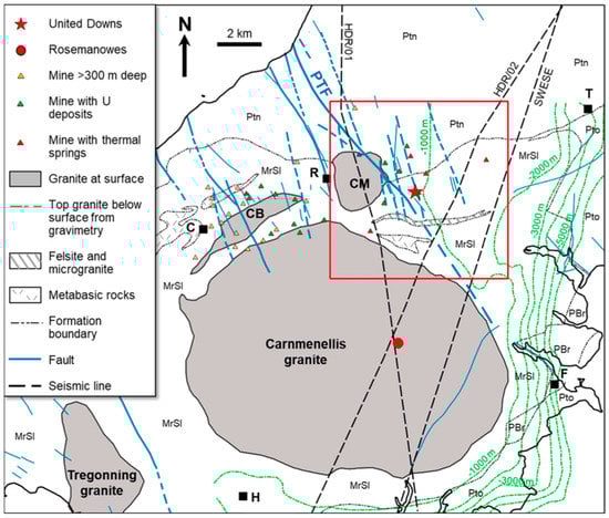The geology of Cornwall is characterized by the Cornubian batholith, which can be distinguished into several plutons. The Carnmenellis granite is one such pluton that formed around 293 Ma ago [12]. The region also comprises metamorphosed Devonian sediments, which are locally known as “killas”. Granites in this region have high contents of uranium (U), thorium (Th), and potassium (K), which result in high heat flow values and the high geothermal gradient. There are a few thermal springs in the vicinity of the site. The granitic outcrops, mines with U deposits, and thermal springs, along with faults, are shown in Figure 2. The Carnmenellis granite was estimated to be about 10 km deep, and the temperature at that depth was °C [11,13].