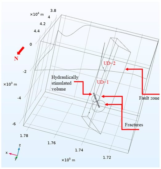Schematic geometry used to simulate a cubic space of the UDDGP geothermal system. The hydraulically stimulated region is depicted by a cylinder around UD−1. Two critically stressed large-scale fractures, subparallel to the PTF, are implemented based on the seismic events as documented by, e.g., [11] and indicated with a disc shape.