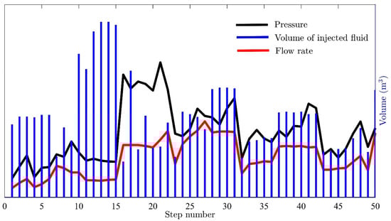 Daily flow rate, injection pressure, and injected volume of the hydraulic testing/stimulation operation on UD−1 from September 2020 until January 2021. Here flow rate, pressure, and injection volume are hidden for commercial issues. The black and blue colors indicate the pressure and volume of the injected fluid.