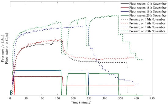 Pressure and flow rates of the four days of hydraulic testing/stimulation operation performed in UD−2 from 17th to 20th November 2020. Due to confidentiality, exact flow rate and pressure values are hidden and are shown only in terms of multiplication of x.