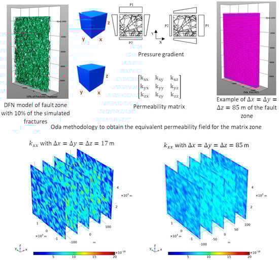 Oda methodology [27] to calculate the equivalent permeability field and its sensitivity to the two different mesh sizes (17 and 85 m, respectively). Upper left: first, a stochastic DFN of the fault zone and host rock is created based on the fracture network characteristics; Upper middle: then, using the Oda approach, a permeability field is calculated for each cell of a given grid (upper right) separately. The bottom panels show the heterogeneous permeability field for the matrix zone for two different mesh sizes for the equivalent permeability estimation (lower right and lower left). The unit of permeability is m2.