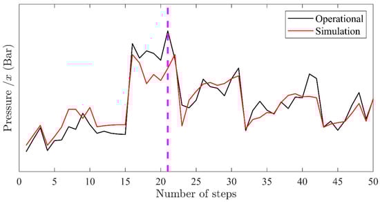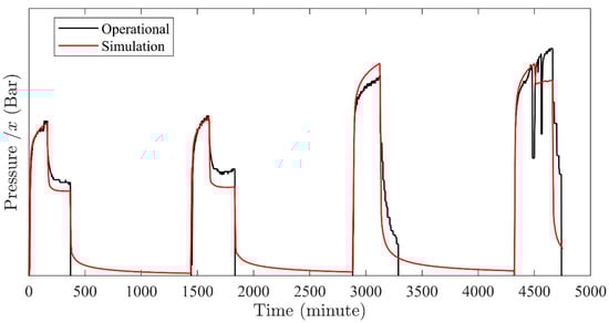 The obtained permeability field through the UD−1 well data is validated with the hydraulic testing and stimulation data of well UD−2. Figure 9 demonstrates a good match between the operational data and numerical simulation of UD−2 for the first three stages of injection. However, there is a discrepancy between the measured and modeled data, as shown in Figure 6 for 20 November. Based on this figure, the flow rate decreases to zero in the middle of the test and increases afterward. The operational data shows that the injection pressure increases following the initial trend without experiencing an impact due to the intermittent flow rate breaks. The numerical simulation for UD−2, on the contrary, shows that if the flow rate decreases only for a short time interval, pressure decreases for the rest of the entire injection step and does not reach the previous pressure level. The observed low pressure after a short gap in the injection is not due to the permeability change. Rather the pressure diffuses inside the system leading to pressure drop. It, therefore, seems likely that the flow rate stops and pressure drops are rather a measurement error while reporting the pressure and flow rate data or that the wellbore effect [26] between the wellhead and the reservoir section mitigates the flow rate and pressure drops.