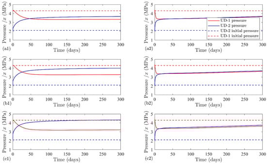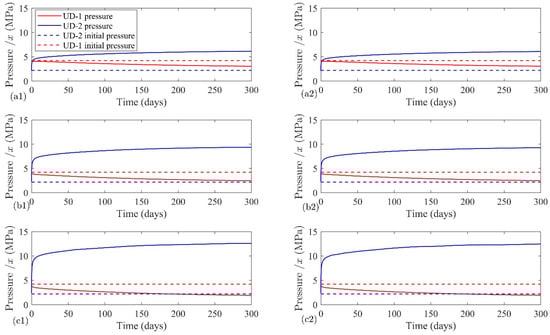 Simulated pressures at the injection and production wells for the injection flow rate of (a1,a2) L/s, (b1,b2) 2 L/s, and (c1,c2) 3 L/s after the permeability enhancement through the considered chemical stimulation. The left column shows a permeability enhancement by a factor of 10, and the right column shows a permeability enhancement by a factor of 100 with respect to the initial values.