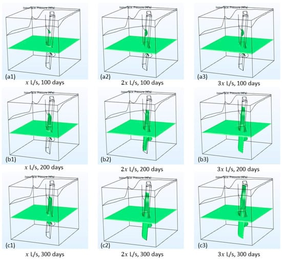 Figure 11 shows the pressure plume development at iso-surface of MPa after 100, 200, and 300 days of the injection. At the early time, the pressure around the UD−2 is lower than MPa, and around the UD−1, pressure is higher than MPa. Therefore, small pressure iso-surfaces around the wells being observed. As time goes on, the pressure near UD−2 increases and near the UD−1 decrease, and the trend of these changes in Figure 11 is clearly obvious. Obviously, with increasing the injection and production flow rates, the plume size increases. Furthermore, due to the higher permeability of the fault zone, pressure changes mainly happen inside the fault zone and two large-scale fractures, which are detected through seismic events. These sharp pressure changes (and consequently the stress changes not discussed in this paper) inside the fault zone requires special attention to examine the possibility of the seismic events.