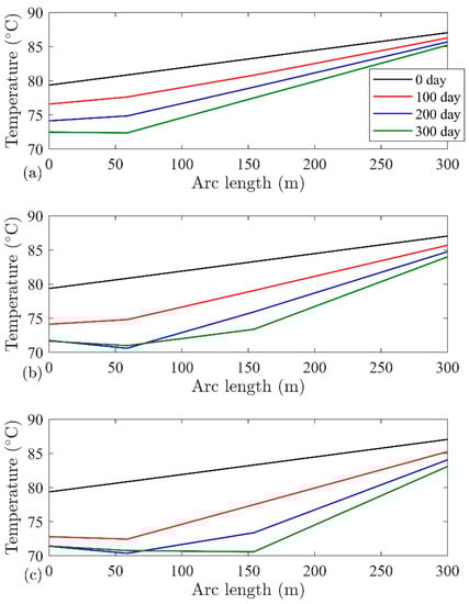 Simulated temperature alongside the open hole section of the injection well UD−2 for the injection flow rates (a) L/s, (b) 2 L/s, and (c) 3 L/s. The arc length is measured from the top of the open hole section of the well that falls inside the Porthtowan Fault zone.