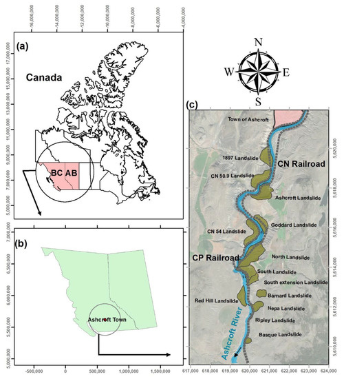 Thompson River valley location (a,b) plan-view and active landslides across the valley (c). Coordinates in UTM (units in meters for scale purposes). BC and AB in (a) correspond to the provinces of British Columbia and Alberta, respectively.