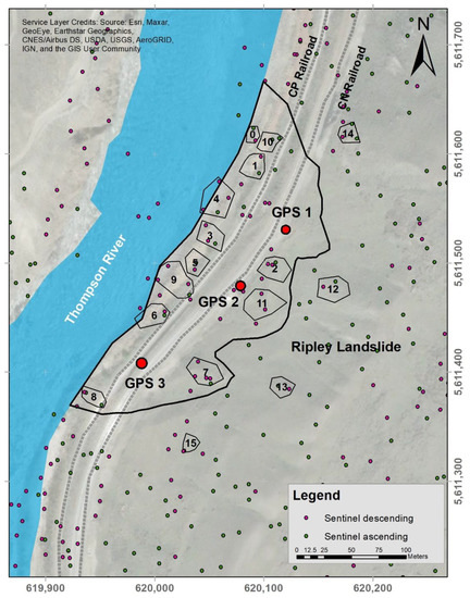 The GPS system monitoring data used in this paper was acquired through an installation by CP and analyzed by the University of Alberta under the Canadian Railway Hazard Research Program. The system consists of three GPS monitoring stations on the Ripley landslide, near the railway tracks and one reference station located on stable bedrock outside the unstable area. GPS stations are Leica single-phase receivers in a differential GPS mode, able to detect 12.5 mm of cumulative ground movement with a variability of mm [15]. Lateral and vertical displacements are processed by the Leica GeoMOS software and information on the system’s latitude, longitude and vertical coordinates is provided at an hourly frequency. Hourly readings are used to calculate daily positioning of the GPS stations. The GPS displacement data in this paper corresponds to that published by Macciotta et al. [15] for the period between April 2008 and October 2014. (All three GPS started recording data in April 2008. GPS-1 and GPS-3 recorded data until 21 October 2014, while GPS-2 recorded data only until 29 April 2014. All three systems showed some data gaps associated with repairs and maintenance of the system.) These data are used to validate the landslide deformation trends (directionality) obtained by InSAR, assuming the landslide has not suffered changes in the direction of movement. Unfortunately, no displacement vector datasets coincide with the InSAR processing period in this paper. Positive values for horizontal movement show displacements in the downslope direction and negative vertical values show downward movement [15]. Figure 3 shows the proximate locations of each installed GPS system.
