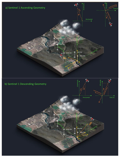 Geometry of the image acquisitions along the ascending (a) and descending (b) orbits (inspired by ground deformation InSAR analysis over the Thompson Canyon, British Columbia, Technical Details, August 2018, by TRE Group).