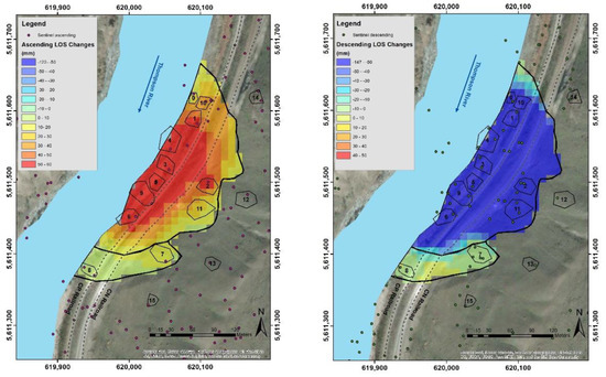 Figure 5 illustrated the scarcity of PS on the Ripley landslide from Sentinel ascending and descending orbits. Despite this low scatterer density, selected regions on the landslide did include scatterers for both satellite orientations so that an average R vector could be calculated. LOS results show faster deformations at the landslide’s toe and slowing towards the upper areas of the landslide. The LOS displacement for both satellite orientations is significantly lower outside the landslide extents to the north and south.