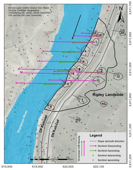 The LOS vectors in the horizontal plane for each area of analysis are shown in Figure 6. The magnitude and direction of LOS vectors for each area are located on the center of the area while it is representative of the average values for all captured points within the area. LOS directions for the same orbit are all parallel, given that LOS direction is defined by the orbit geometry. This figure also shows the direction of the average slope azimuth. It is observed that LOS magnitudes are large and of similar magnitude near the river, and significantly decrease near the back scarp of the landslide. Figure 7 shows the cumulative LOS deformations for each area for both Sentinel ascending and Sentinel descending orbits. Acceleration periods tend to start in the fall and deacceleration tends to start in the spring. These show clear episodes of acceleration and deceleration, consistent with previous observations [14,15,16]. In this published study the acceleration corresponds to the drawdown effect of the Thompson River on the Ripley landslide.