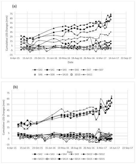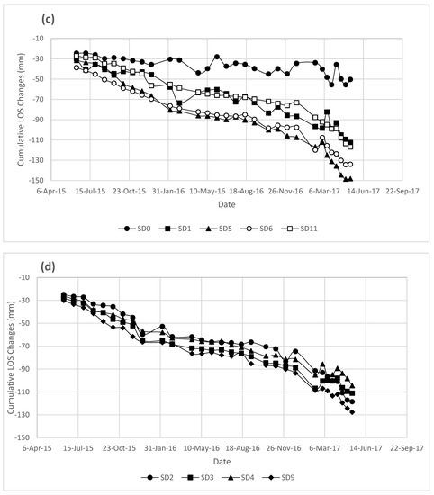 Average cumulative LOS displacement for both Sentinel ascending and Sentinel descending orbits for specific areas within the Ripley landslide (SA for Sentinel ascending and SD for Sentinel descending). (a) SA 0,1,5,6,7,8,10,11 and SD 7,8,10—(b) SA 2,3,4,9,12,13,14,15 and SD 12,13,14,15—(c) SD 2,3,4,9—(d) SD 0,1,5,6,11.