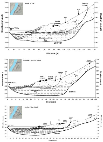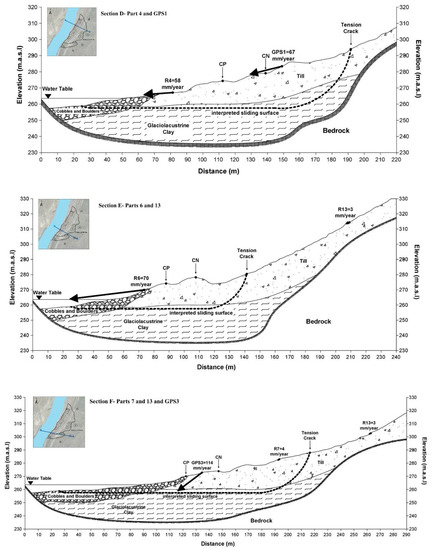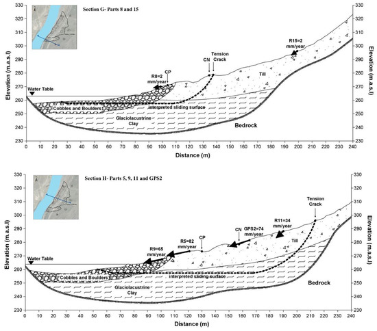 Figure 9 illustrates the ground movement velocities in section view on different cross-sections defined on the Ripley landslide. These sketched section views were inspired by previous research [14,18]. GPS average annual velocity vectors are also shown in the cross-sections intersecting the location of the GPS units. Table 3 presents the magnitudes of R, azimuth and horizontal angles (angle between R and the horizontal plane).