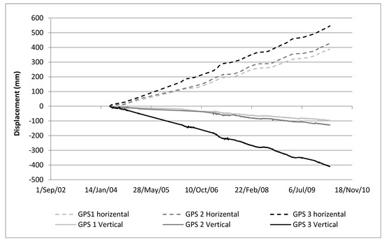 GPS data were selected between the installation day on 11 April 2008 and 11 April 2014. Annual results for the 6 years are averaged to get an estimated characteristic annual ground movement. In this regard, Macciotta et al. [15] showed that, in general, the acceleration and deceleration trend of the Ripley landslide measured by the GPS system was consistent for this period. The time series of GPS cumulative displacements in this period are presented as vertical and total horizontal components in Figure 10. Figure 11 shows each GPS horizontal displacement in plan-view together with the calculated R vectors. The summary of recorded displacement by each GPS is shown in Table 4. The GPS velocities in Table 4 are consistent with the calculated velocities for the R displacement vectors near the toe of the landslide.