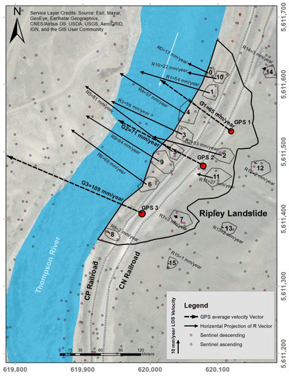 Figure 8 shows the plan view of the total horizontal component of the calculated R for the selected areas on the Ripley landslide. The satellite data used for calculating R correspond to the period between 26 May 2015 and 21 May 2017 for ascending orbit data and between 10 June 2015 and 12 May 2017 for descending orbit data to estimate annual displacement. The results are shown as average velocity of the real displacement vectors for each selected area in mm/year. Velocities are less than 3 mm/year behind the known back scarp and ranged between 12 and 53 mm/year at the back scarp within the landslide body, and up to 81 mm/year close to the river, which shows very slow to slow ground movement according to the velocity classification by [41,42]. These results are in agreement with the reported results by Huntely et al. [43], both in magnitudes and directions, which report displacements between 68 and 82 mm/year for different locations within the Ripley landslide body with the maximum ground movement occurring in the middle of the toe slide [43].