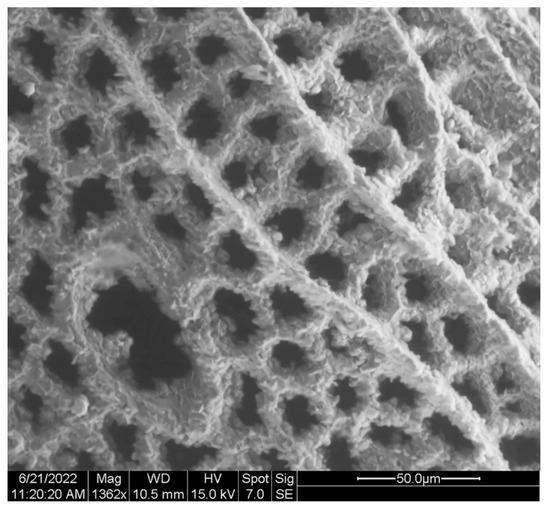 Kirkbya panamintensis nov. sp., detail of right valve. Holotype, IGM 5011(1). Scanning electron micrograph (secondary electrons). Crystal encrustations on the valve network are quartz crystals. Scale bar = 50 microns.