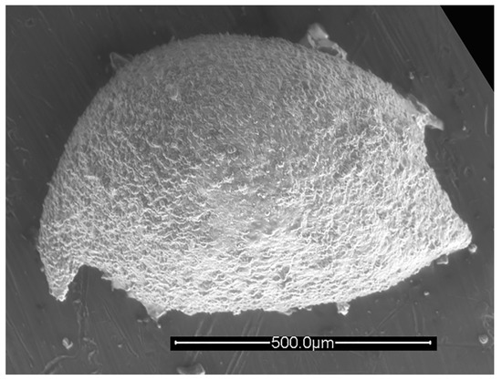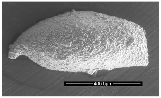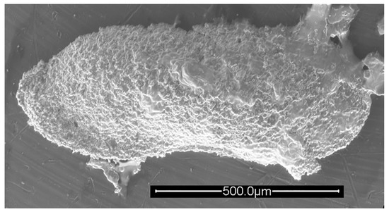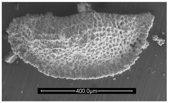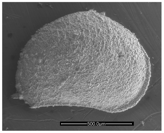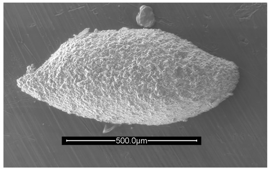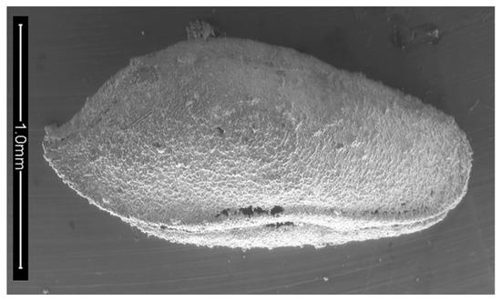 Rectobairdia sp. cf. R. legumen (Jones and Kirkby, 1886), left valve, lateral view. IGM 5011(5). Scanning electron micrograph (secondary electrons). Scale bar = 500 microns.