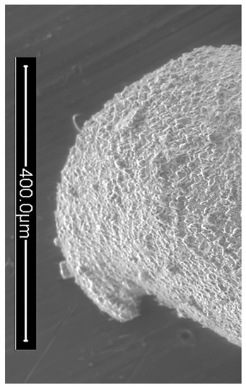 Acratia sp. D, left valve, close up of anterior of valve. IGM 5011(11). Scanning electron micrograph (secondary electrons). Scale bar = 400 microns.