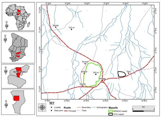 From a geological point of view, the Guéra province in which the town of Mongo is located, is a crystalline basement zone which belongs to the Pan-African Belt of central Africa [7,8,9,10,11,12,13]. The Guéra granitoids have been dated between 560 and 590 Ma [13]. The massifs of the town of Mongo, capital of the Guéra province, which were the subject of this study, are points of this crystalline basement. According to [13] they should correspond to the syntectonic circa 590 Ma biotite granites. On the other hand [12] states that Oyo massif is made of diorite. They constitute sufficiently important massifs to suggest that the resources are abundant for use in the construction industry (Figure 2).