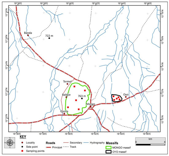 For the mineralogical composition, four samples were taken, i.e., two samples per massif and analyzed at the Geosciences Laboratory of Superficial Formations of the University of Yaoundé I (Yaoundé, Cameroon) after preparation of thin slides of 30 µm thickness.
