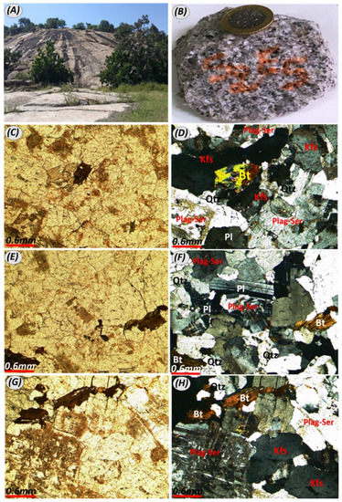 Mongo massif; (A) outcropping conditions (field of view is 20 m wide); (B) hand sample; (C–H) thin slide optical microscope views alternatively without or with crossed nicols (left and right) with phase identification indicated (quartz = Qtz, orthose = Or or Kfs, biotite = Bt, sericitized plagioclase = Plag-Ser).