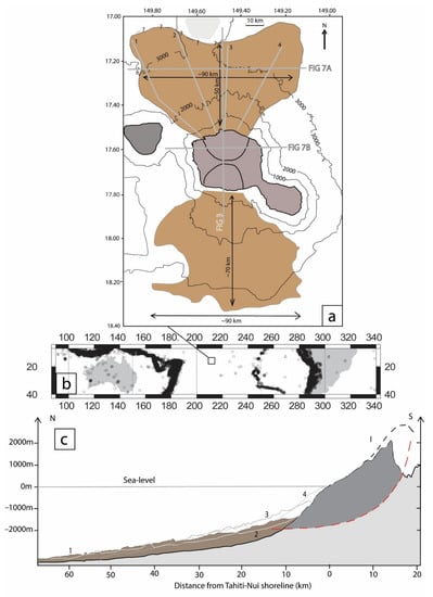 Map and section of Tahiti Island, French Polynesia. (a) The northern and southern landslide deposits on Tahiti Island are represented in brown. (b) Location of Tahiti in the Pacific Ocean (box) and seismicity M > 4. (c) The section of the northern landslide deposits is represented in brown for profile 1, and the infilling of the scar by volcanic material is in dark grey. The rotational landslide is in red. The locations of profiles 1–4 are shown in (a). Detailed data are provided in [,].