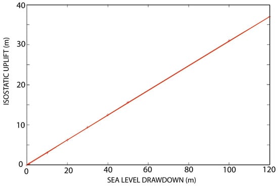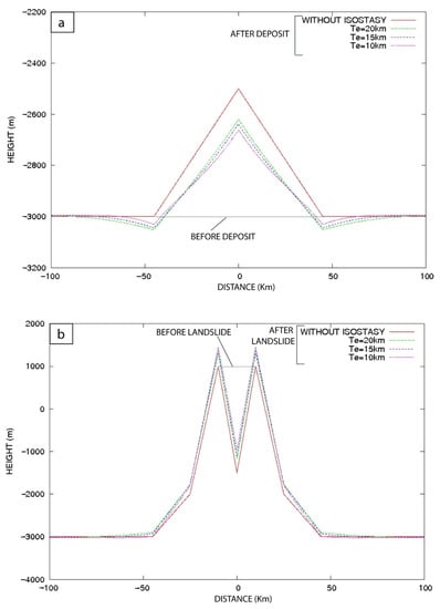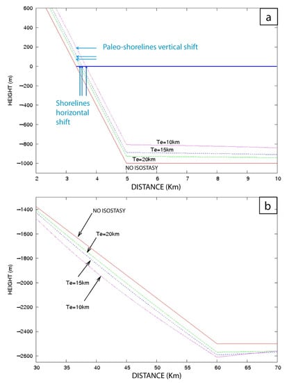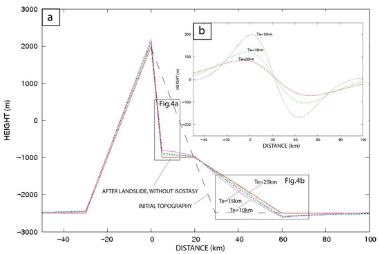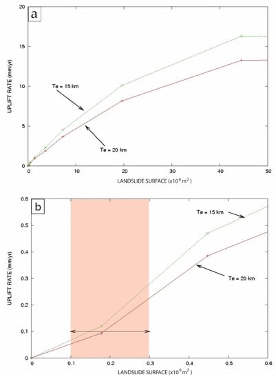 Large landslides (>20 × 106 m2) generate significant deformations (in the case of Figure 3 and Figure 4, the displaced cross-sectional surface was of 22.5 × 106 m2), and moderately sized landslides (2.5 × 106 m2 < S < 5 × 106 m2) also cause non-negligible uplift (Figure 5a,b), which depends on the cross-sectional surface affected by the landslide and the rigidity of the crust. Coastal uplift ranges from 0 m to approximately 160 m for an abrupt mass unloading surface of 0–50 × 106 m2. The calculation was undertaken for various volumes that are summarized in Table 2. More precisely, for a large abrupt mass unloading with a cross-sectional surface removed of 50 × 106 m2 (i.e., a displaced volume of 1000 km3 assuming a width of 20 km), there is 160 m of uplift for elastic thickness Te = 15 km and 135 m of uplift for Te = 20 km (Table 2). For a cross-sectional surface removed of 10 × 106 m2 (i.e., ~50 km3 displaced volume considering a mean width of 5 km), the abrupt mass unloading causes a coastal uplift of 50 m. An abrupt mass unloading with a cross-sectional surface removed of 0.2 × 106 m2 (i.e., ~0.2 km3 displaced volume considering a mean width of 1 km) produces an uplift of 1 m. This last result is comparable with a sea-level lowering of ~4 m that also causes an isostatic adjustment of 1 m (Figure 6).