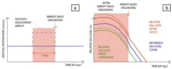 Schematic effect of an abrupt mass unloading, (a) on vertical motion rate, and (b) on relative sea level in the case of subsidence (green dotted line) or uplift (red dotted line).
