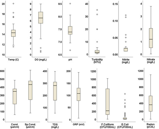 Descriptive statistics for all physicochemical parameters, nitrate and nitrite, fecal coliform, E. coli, and radon are displayed in Table 2 with water quality standards for each parameter.