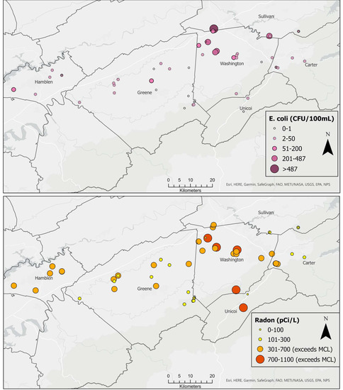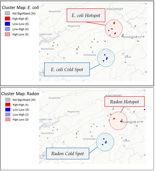 The co-occurrence of radon and E. coli spatial clusters (hot spots and cold spots) in the study area was also noted in other research of E. coli occurrence and transport by radon-222 in Tolo Harbor, Hong Kong [104], and was explained as likely due to the similarity between radon half-life and E.coli decay rate.