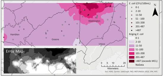Kriging interpolation of E. coli shows a hot spot in northern Washington County. Inset map shows standard error.