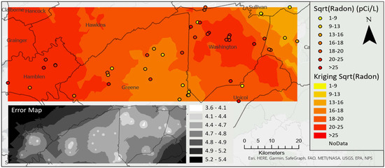 Radon concentrations were not normally distributed, and, therefore, kriging interpolation was completed on the square root of radon concentration. The interpolation for radon identified the hot spot in northern Washington County, with low uncertainty throughout the study area except near boundaries, especially in the northwestern corner where no samples were collected (Figure 6).