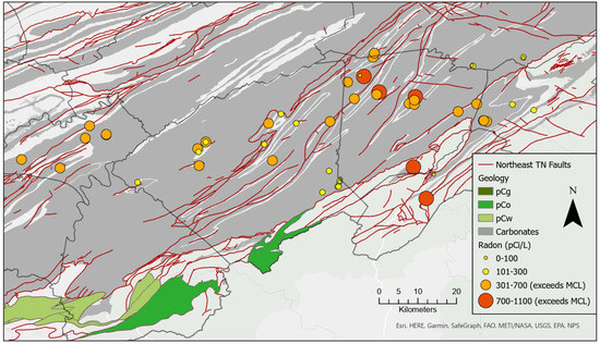 Radon concentration exceeded 300 pCi/L (maximum contaminant level (MCL) proposed by the USEPA for states without an enhanced indoor air program) in 60% of the springs. A recent study of radon in Tennessee well water [25] reported high radon concentrations in wells underlain by older Precambrian rocks on the Tennessee–North Carolina border. Aside from the effect of bedrock geology, karst, well depth, and faulting also influence the concentration of radon in groundwater [25,34,39,40,41]. Moreover, radon concentration in springs may be influenced by the flow rate, such that low discharge volume springs (with less flushing potential) tend to have elevated levels of radon [47].