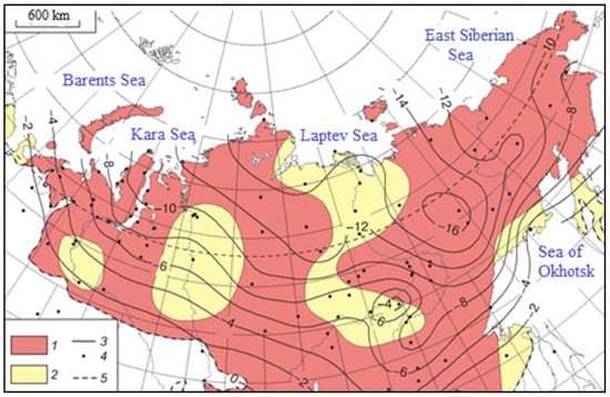 Climate warming has become obvious in the recent sixty or seventy years [1]. Since the 1990s, this effect has shown up in high climatic variability, with numerous anomalies. The magnitude of climate anomalies is commonly estimated by comparing air temperatures for a decade with the long-term climate norm, at three grades (Δtair): small (<0.7 °C), moderate (0.7 °C to 1.0 °C), and large (>1 °C) [2]. Mean annual air temperature variations for northern Russia over 2000–2010 are presented in a map (Figure 1) relative to the climate norm, which varies from −2 to −16 °C in the permafrost zone (contour lines in Figure 1). The map shows only moderate and large anomalies. The Russian permafrost regions mainly fall within the domain of large warming (>1 °C), while moderate warming (0.7 °C to 1.0 °C) is restricted to local areas in the European north, Central, and West and Central (Laptev Sea coast) Siberia, as well as in Primorye [3].