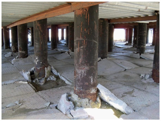 Formation of ice lenses in the ground, or frost heaving, produces uplift forces that can act in tangential (shear) or normal planes, i.e., along the lateral surface or orthogonally to the foundation, respectively [22]. Pile foundations are commonly subject to shear forces that can reach considerable magnitudes and cause major damage to the infrastructure (Figure 2). These forces are caused by soil-pile adfreeze. In 2013–2014, frost heaving caused accidents to two new tanks of liquid natural gas, 20,000 m3 each, in the Zapolariye–Port Pur Pe pipeline system, as 10–15 cm cracks appeared in the cap of piles along the whole perimeter. The ground was stabilized by thermosyphons to −15 °C, till depths of 13–16 m, but the design took no account of the frost-heave uplift forces [23]. Another accident was reported in the same year [24] from the Urengoi area, where a pipeline segment rose 1.5 m above the ground for one year. In general, up to 1 billion USD is spent yearly for maintenance of pipeline structures and mitigation of damage associated with permafrost degradation [25]. One more example of deformation, other than in pipelines, comes from the Norilsk area where about 250 buildings and structures have been deformed for the recent decade out of which 40 houses had to be demolished [24,26].